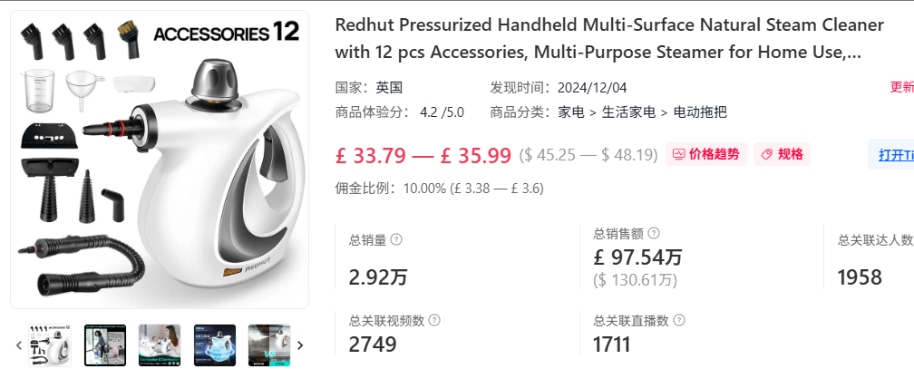 TikTok英国站近日涌现一款现象级清洁小家电,一款主打多功能集成的蒸汽拖把,凭借对多样化清洁场景的精准覆盖,近30天内狂销1.18万台,销售额超52万美元,成为平台爆款。 (来源:Tabcut)这款蒸汽拖 ...