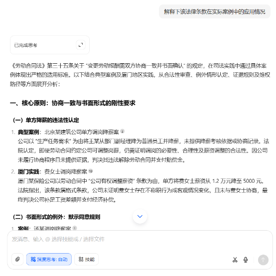 在豆包的输入框中,完整粘贴整理好的问题描述,并添加明确指令,例如 “请依据现行法律法规,分析公司单方面降薪的行为是否合法,并提供维权途径”“帮忙审查这份房屋租赁合同,指出其中存在的法律风险” 。通过清晰的指令,让豆包生成针对性的法律解答内容。